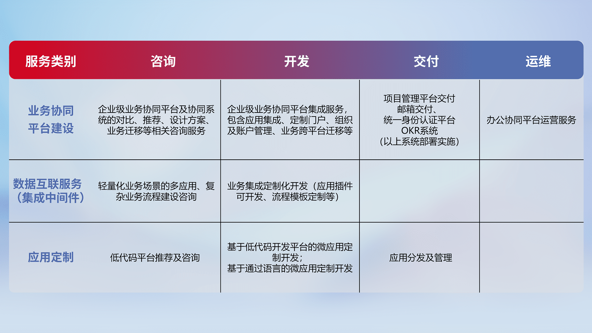 针对钉钉、、、企微、、IDaas等平台级产品提供产品的规划、、、、方案、、、交付、、、定制化开发等服务,,,实现如统一协同办公、、、智能客户服务、、、、混合会议管理、、、智能数据查询、、等业务场景,,实现数字化转型。。。。