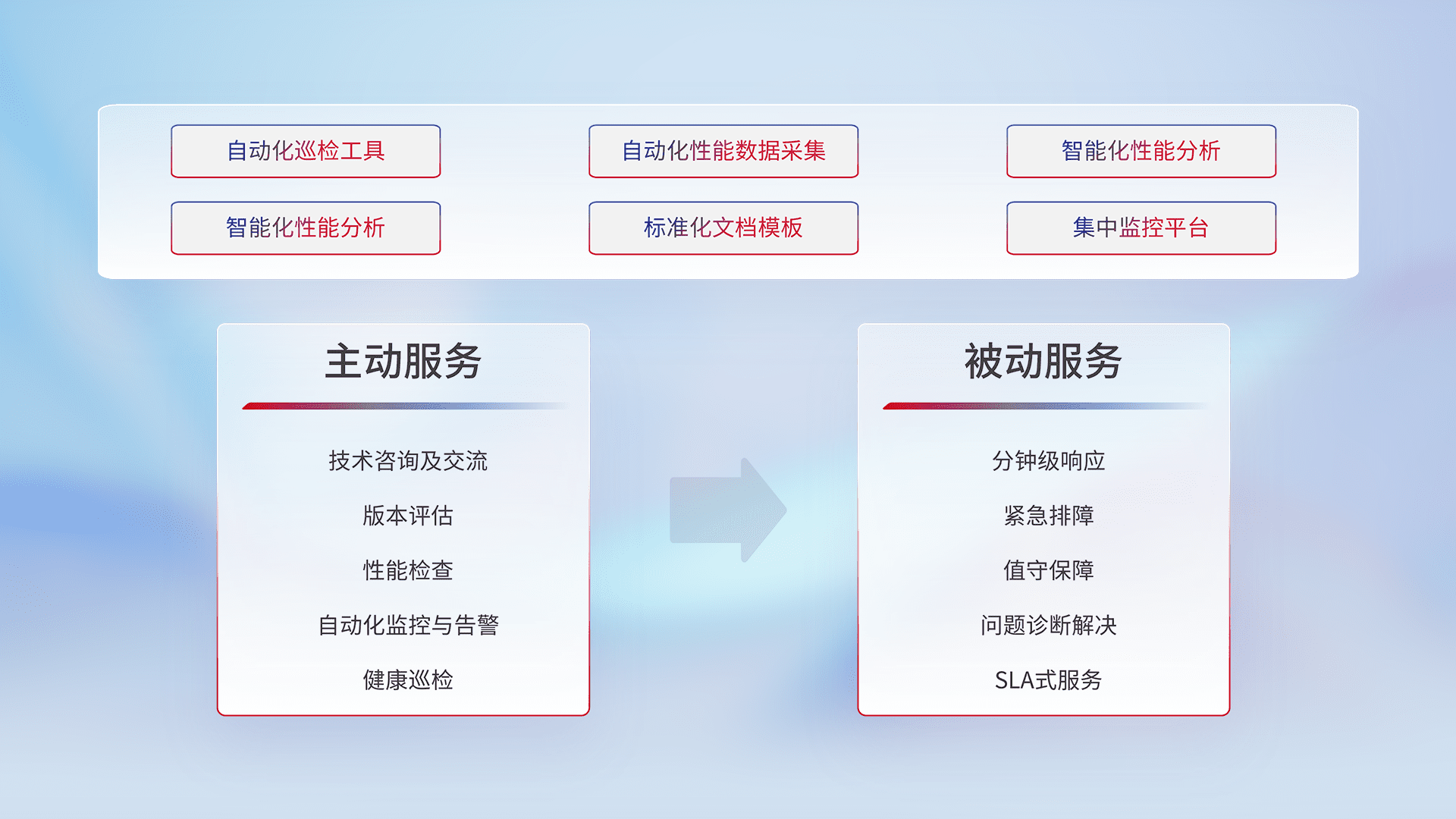 智能化工具和标准化文档,,,保障服务质量,,,,提供主动服务(包含技术咨询、、版本评估、、、性能检查、、、、自动化监控与告警、、健康巡检)和被动服务包含(分钟级响应、、紧急排障、、、、值守保障、、问题诊断解决、、SLA服务)。。。。