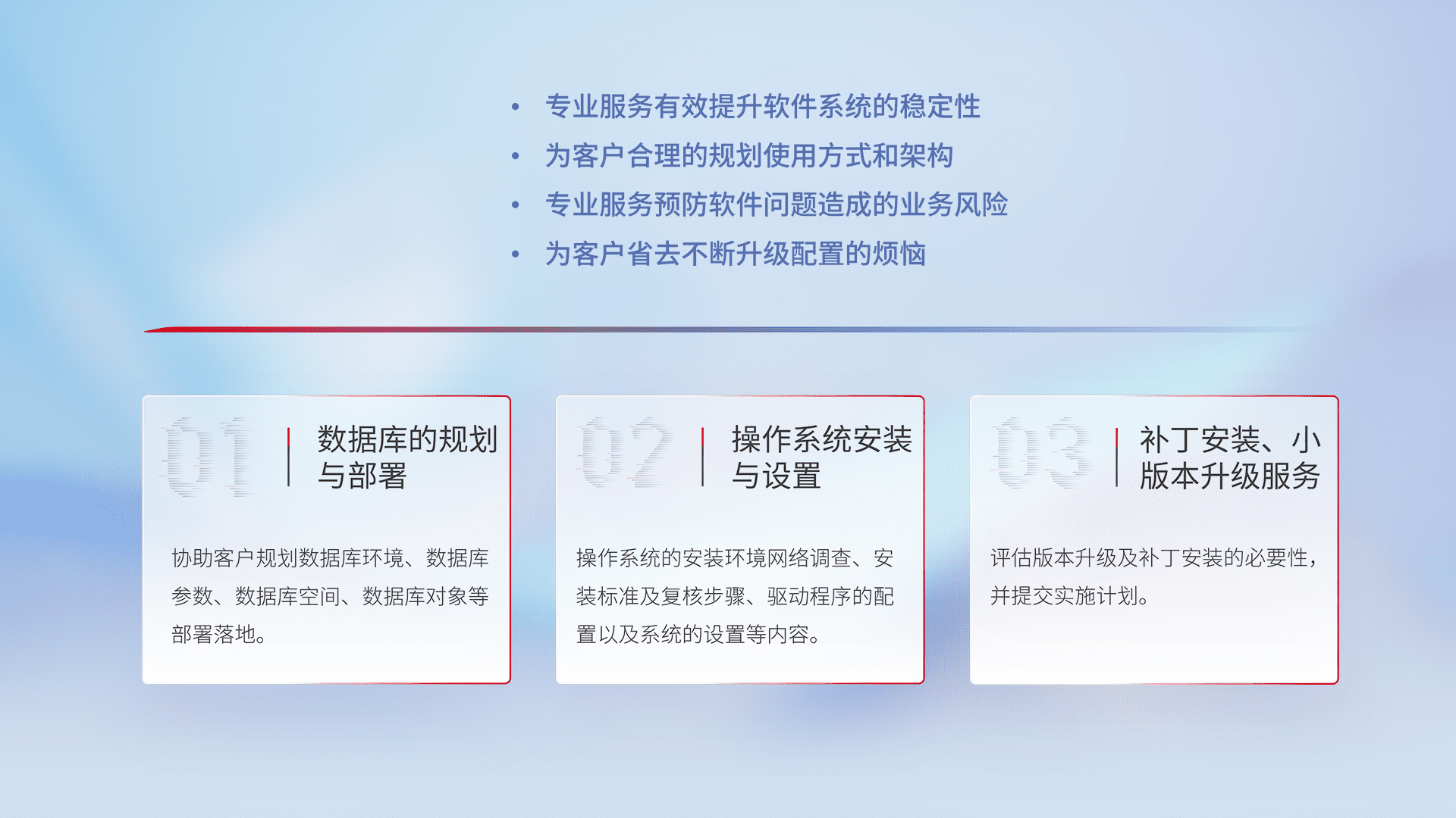 为客户提供软件规模升级、、、、快速部署、、、、按需配置的专业服务,,,从数据库的规划与部署到操作系统的安装与设置,,,,再到补丁安装和小版本升级提供支持。。。